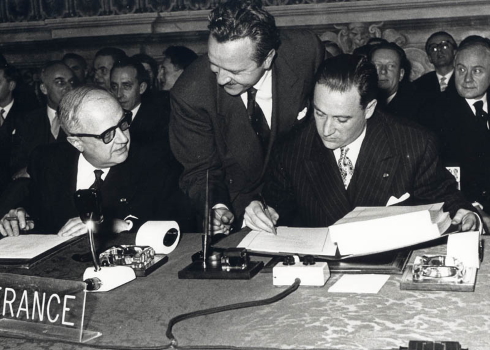 Christian Pineau et Maurice Faure lors de la signature pour la France.