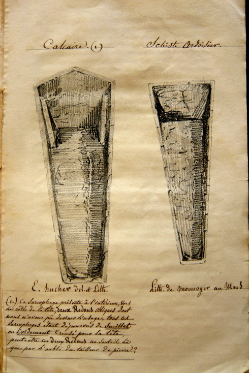 Solesmes. Plusieurs sarcophages en grès coquillier sont découverts dans un rayon de 100 m, autour de l'église paroissiale. L'un d'eux est trouvé en 1927, près de l'église abbatiale Saint-Pierre, dans la clôture, au pied de la chapelle du Sacré-Cœur, près de l'ancien cimetière. Le pied de la croix, à triple traverse, sculptée sur le couvercle, porte une inscription gravée en creux.