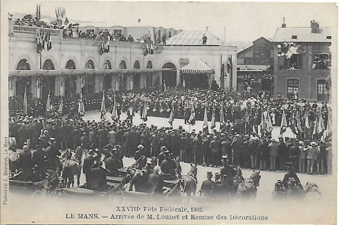 Revenons au début du 20e siècle pour accueillir Émile Loubet, Président de la République, arrivé par le train. Une foule d'officiels, militaires et badauds, attend l'éminent personnage qui procède à l'incontournable remise de Décorations. De la gare, c'est en calèche qu'il rejoint les Jacobins en passant sous cinq gigantesques arcs de triomphe dressés en son honneur (avenue Thiers, boulevard René-Levasseur, place de la République, carrefour de la Sirène, entrée du Quinconce). Arsène Le Feuvre, décorateur au Mans, en est le concepteur.