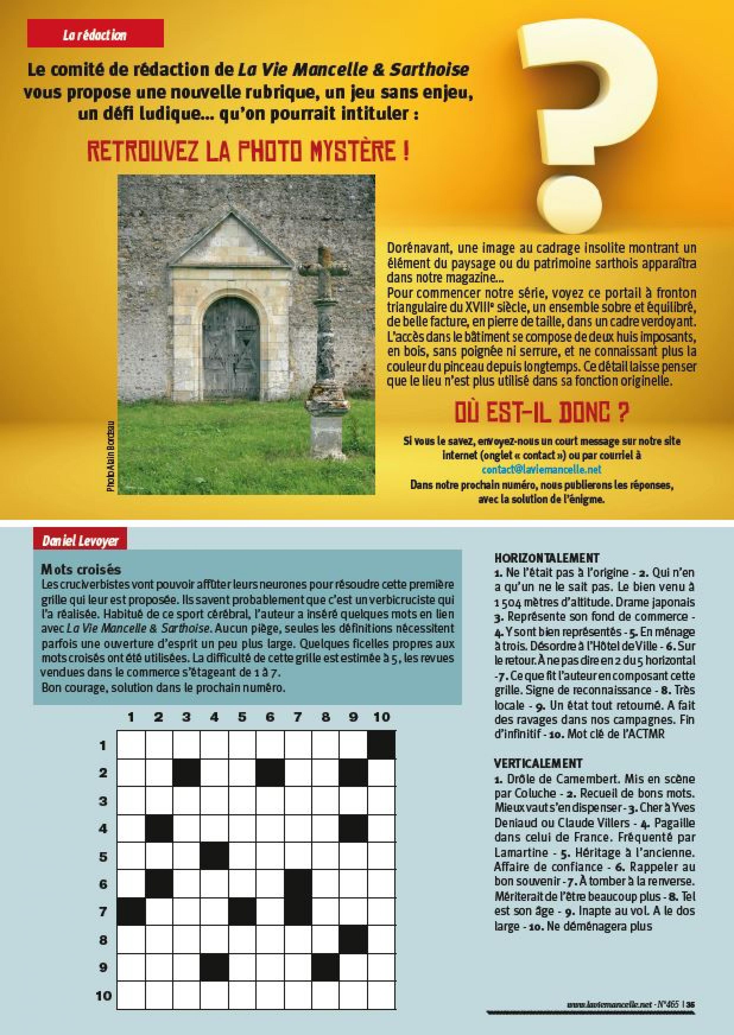 Mais plutôt que faire une liste fastidieuse des nombreux sujets abordés, mettons l’accent sur quelques rubriques qui font leur première apparition dans ce numéro tels La photo mystère, les mots croisés, un conte en préambule au dossier et Eune miette de patois, concoctée par le spécialiste du langage de notre terroir, Serge Bertin.