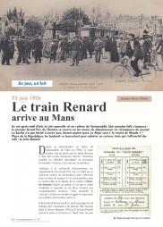 23 juin 1906 Le train Renard arrive au Mans, il s´affranchit des rails : premier Grand Prix de l´histoire, le train à « propulsion continue » Auteur(s) : Minier Jacques-Henry Genre/Thème : Un jour, un fait