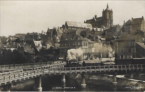 Ce qu’il conçoit, sans doute le plus remarquable de son œuvre non seulement mancelle, mais sarthoise, comble la fierté de nos ancêtres : le pont en X ! Il permet de concilier la circulation des automobiles, des tramways électriques et leurs frères à vapeur, tous devant traverser la Sarthe dans le même secteur. L’ouvrage d’art, qui coûte 45 000 francs de l’époque, est inauguré le dimanche 9 octobre 1898, par M. Viger ministre de l’Agriculture, en même temps que la gare des Tramways de la Sarthe.