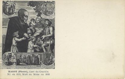 À la suite d’une de ses actions charitables envers des prisonniers, Pierre Ragot fut ordonné prêtre en 1643. Au cours de 1677, les glaces signalées partout, comme en Touraine à Bréhémont, et en Anjou, à Saint-Martin de la Place, saccagèrent les plantes. Les privations se trouvaient aggravées par une épidémie de dysenterie et la guerre de Hollande. Effectivement, au cours de la saison froide nos troupes revenaient au pays, en garnison, et il fallait aussi les nourrir ! Pierre Ragot fut de ceux qui se multiplièrent pour venir au secours des plus démunis.