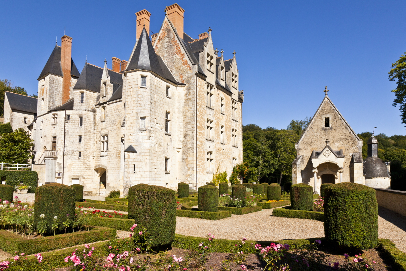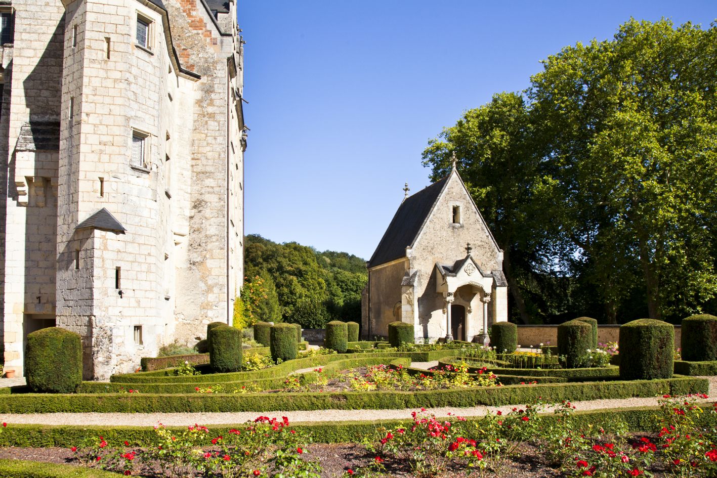 Vue sur la chapelle et les jardins