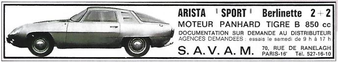Le modèle Arista Passy doté de ce moteur atteint les 135 km/h. Sa carrosserie en matière plastique est dessinée par le styliste Berlemont. La Société SAVAM le diffuse pour 1 200 000 francs au moins. Hélas, l’aventure Arista ne dure que de 1954 à 1958 !