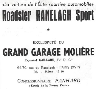 Quelques jours avant l’ouverture du Salon de l’Automobile de Paris 1950, apparaît en avant-première le roadster Ranelagh. La cérémonie se déroule au théâtre de l’Appolo, à Paris, lors d’une réunion de presse. Parmi les surprises montrées par la jolie nouveauté, chacun peut constater qu’elle possède un pare-brise rabattable !