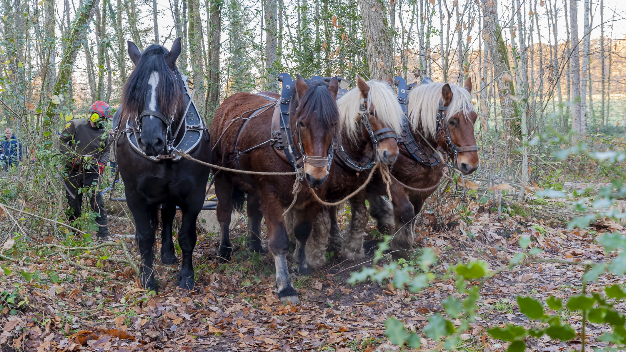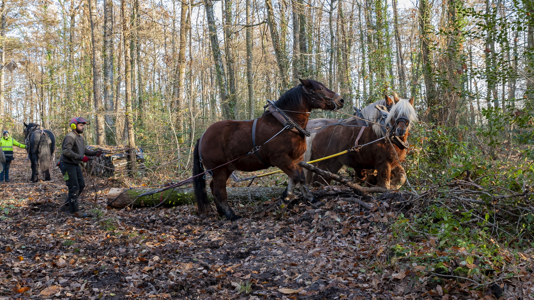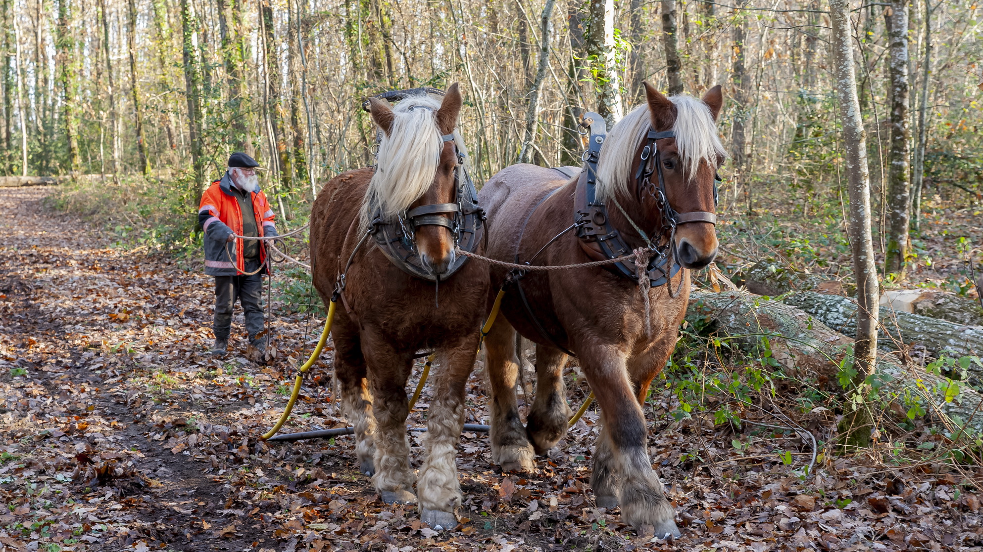 Croissant sur ce terrain depuis environ 100 ans, ils sont débardés le samedi 17 décembre 2022 par des chevaux convoyés par leurs propriétaires : Christine Sallé, Jean-Baptiste et Vivien Ricard. Les quatre colosses procédant à l’opération, particulièrement bien dressés, réagissent au moindre mot pendant toute leur tâche. D’origines diverses puisque l’attelage se compose de Doupette, une percheronne, Câlin, un ardennais, et de deux comtois : Iris et Oliver.
