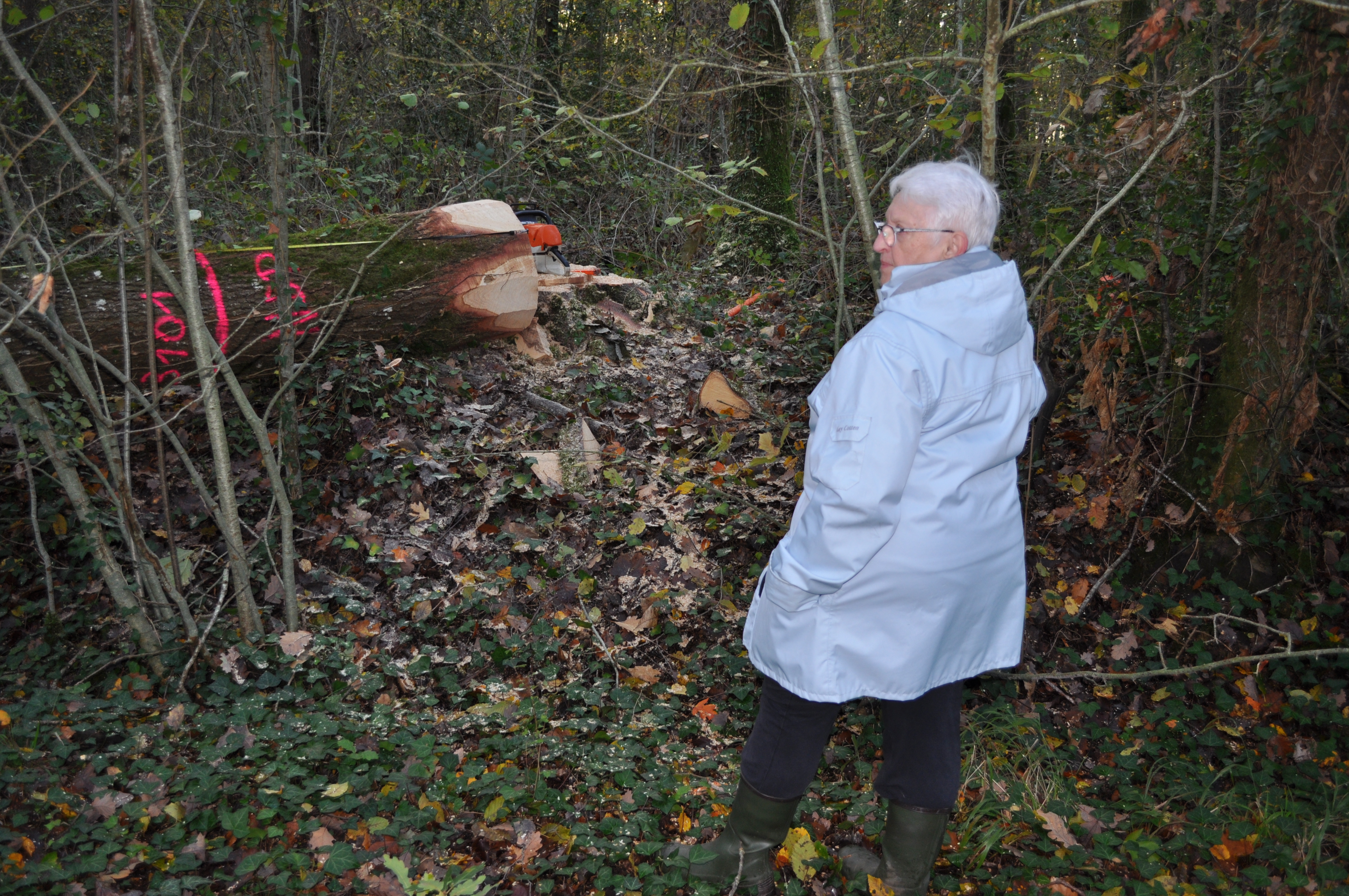 Anne devant l'un des chênes abattus