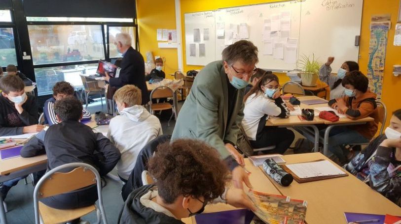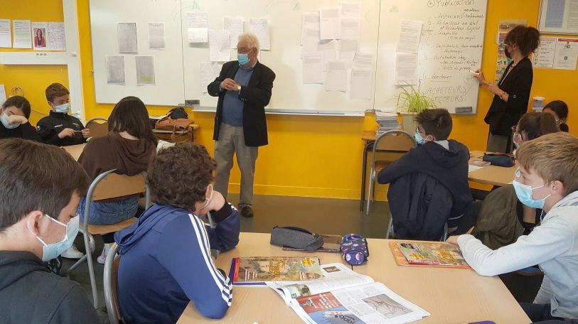Jacques-Henry répond aux questions des élèves : comment la VMS a travaillé après la remise de leurs textes, le comité de relecture, la recherche de quelques illustrations complémentaires, la mise en pages etc